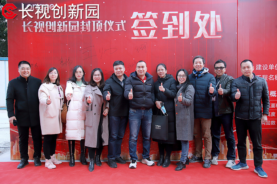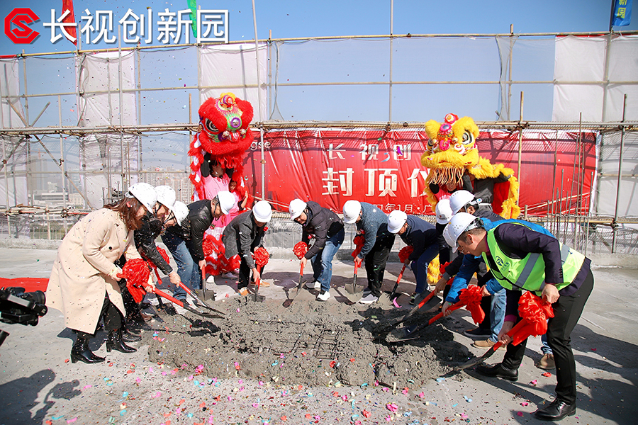 儀式最后一環(huán),各領(lǐng)導(dǎo)和來(lái)賓移步到樓頂用鐵鍬封頂,意味著長(zhǎng)視創(chuàng)新園封頂儀式圓滿結(jié)束。