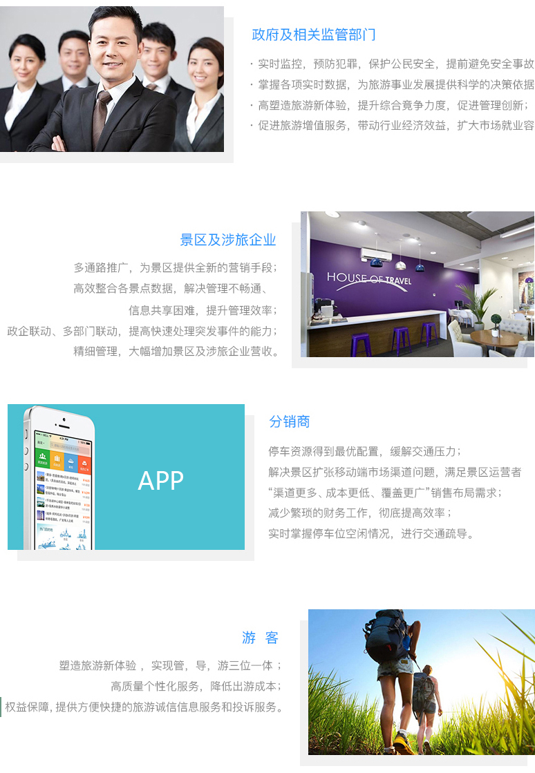 依托景區(qū)大數(shù)據(jù)分析提供增值服務,為景區(qū)管理者制定發(fā)展策略,提供有效的數(shù)據(jù)支撐;幫助景區(qū)邁入智慧管理時代,為景區(qū)、為游客省心、省時、省力、省事又省錢!